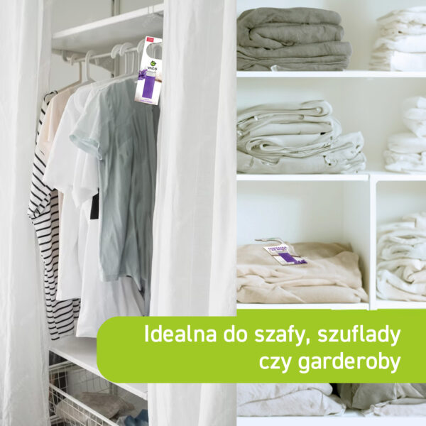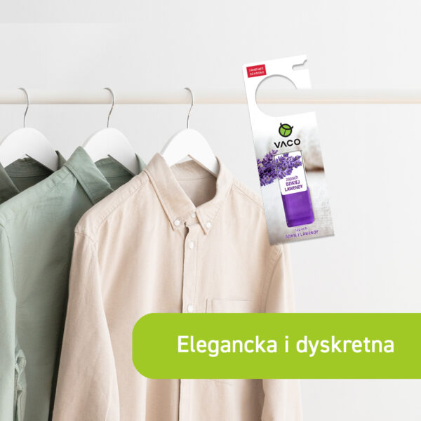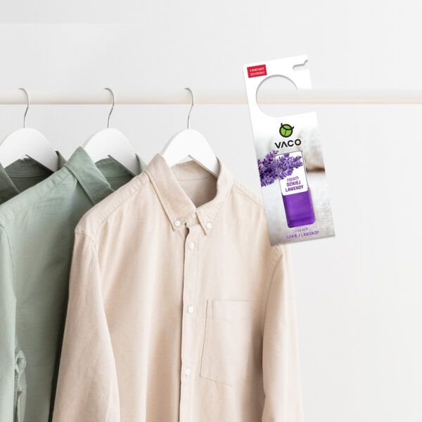 Zawieszka VACO zaskoczy cię świeżym lawendowym aromatem, który również odświeży ubrania, tworząc przyjemną atmosferę w twojej garderobie. Dzięki temu, otoczenie w twojej szafie stanie się nie tylko bezpieczne, ale także przyjemne dla zmysłów.