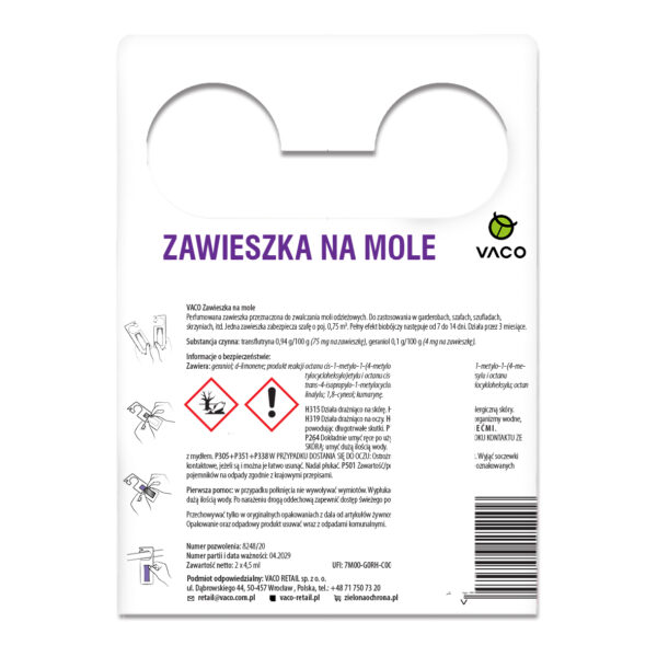 Dzięki swojej wydajności, zawieszka VACO zapewnia skuteczną ochronę aż do 3 miesięcy. Produkt jest ekonomiczny i wygodny w użyciu, co sprawia, że będziesz mógł cieszyć się spokojem i pewnością, że Twoje ubrania są bezpieczne przez długi czas. Nie musisz się martwić o regularne wymiany czy konserwację, ponieważ zawieszka zachowuje swoją skuteczność na dłużej, zapewniając nieprzerwaną ochronę Twojej garderoby.