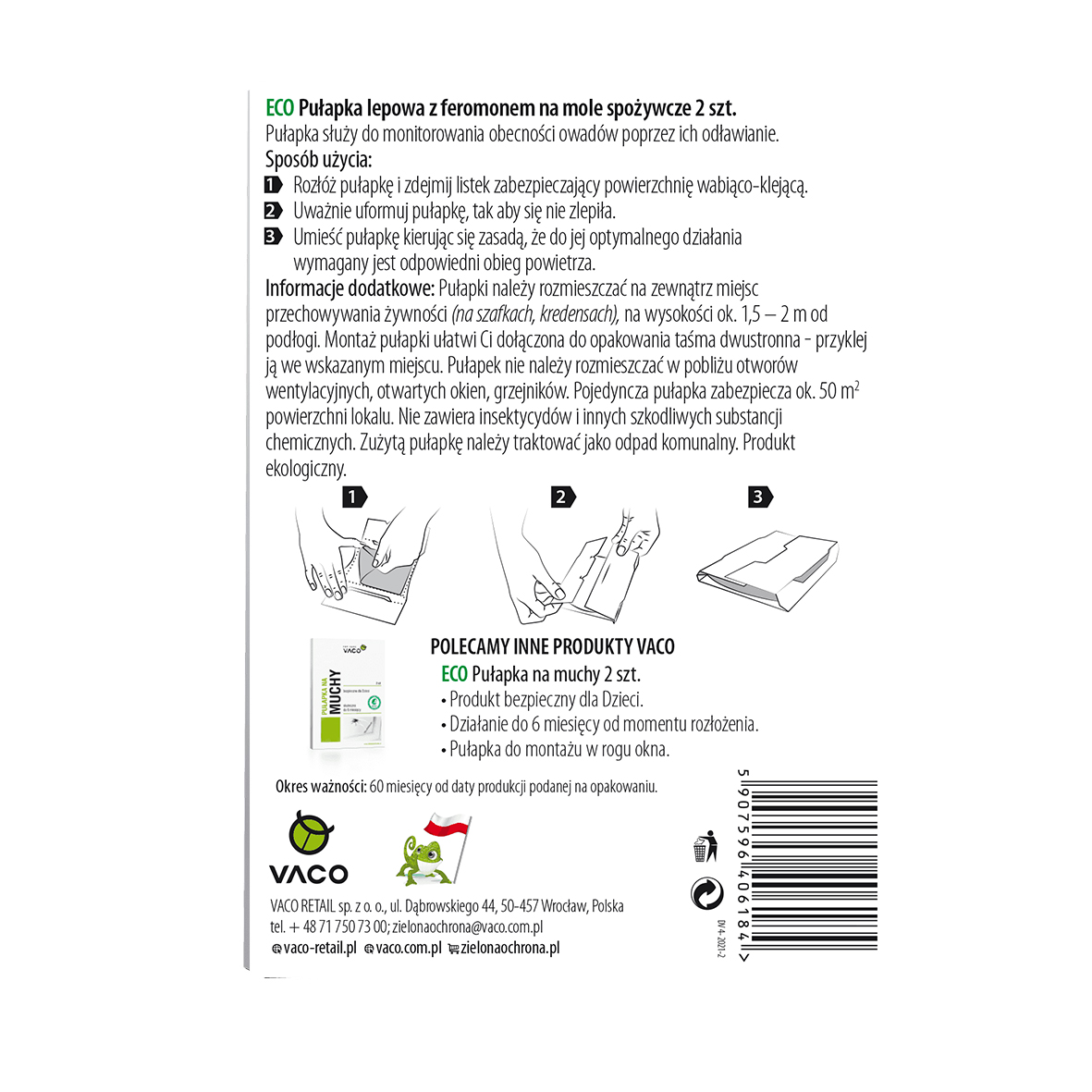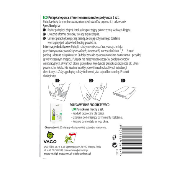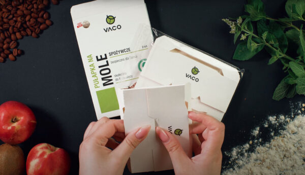 ECO Pułapka na mole VACO przyciąga owady skutecznie, zachęcając je do wejścia do środka pułapki. Dzięki niej możesz monitorować obecność owadów w swoim domu. To rozwiązanie nie zawiera żadnych szkodliwych substancji biobójczych, co czyni je bezpiecznym zarówno dla dzieci, jak i zwierząt domowych.