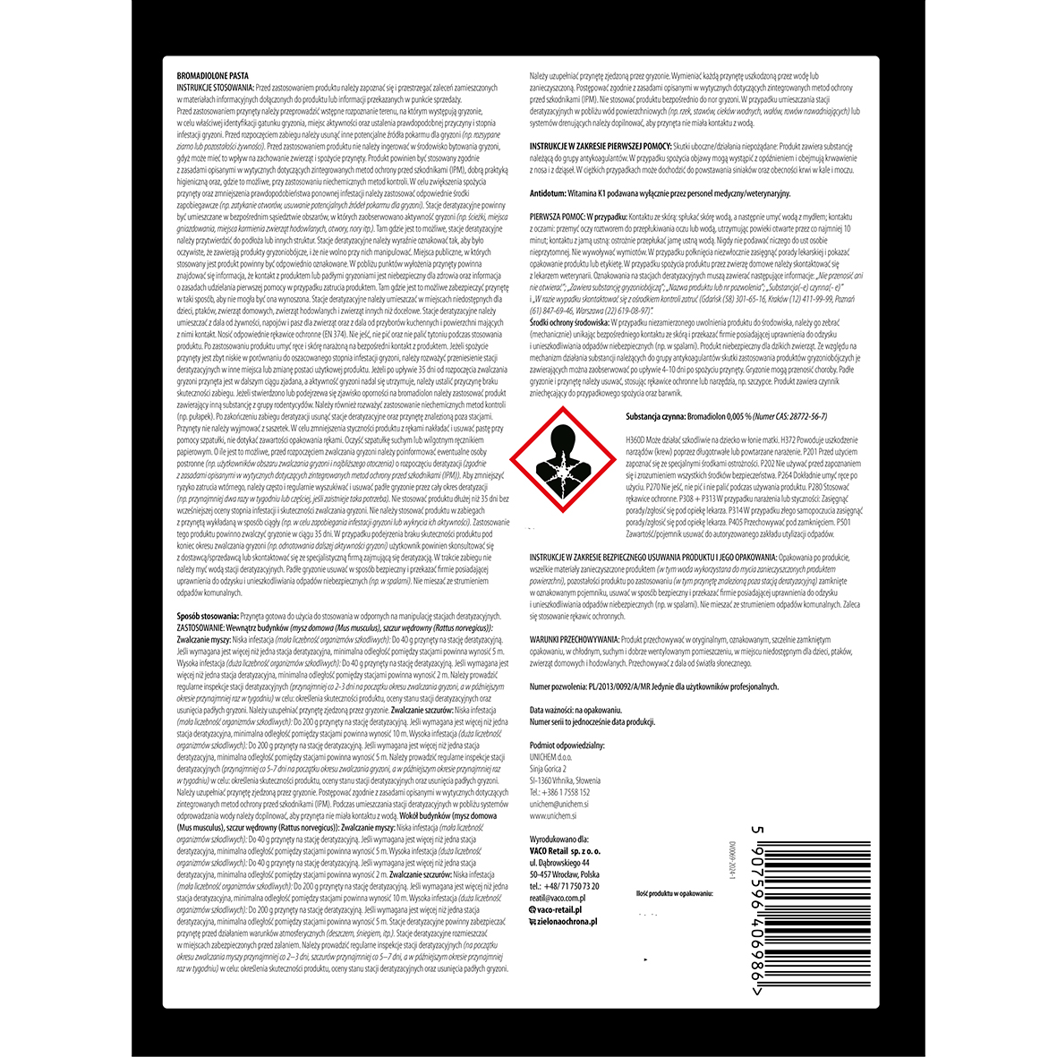 - Substancja czynna: Bromadiolon 0,005 g/100 g