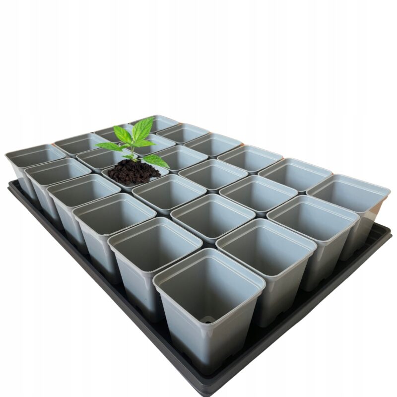 Kompletny zestaw do rozsady zawierający tacę 60 x 40 cm i 24 szare doniczki P9 (0.5 L). Wykonany z wysokiej jakości materiałów, zapewnia optymalny rozwój korzeni roślin.